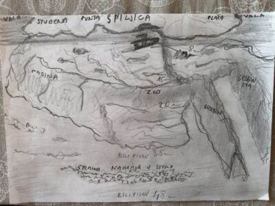 Vezao se na sidro na 8 m pustio ga niz kurenat(struja)duplo. Kontrolirao opremu i pustio se sa ronilicom SUEX na zid na 20 greben 1.2.na 35m bili čisti zlatni pisak. Krenio prema studenoj vali. Ispod kamenja u strmini padaju na 47m. Nigdi za vidit crveni zid šta mi ga Mišo spominja.Vračam se na 35 38 ronilica suex me vuće strašno. Ne bi mogao toliko terena proć bez nje. Vidim – 12 min deco! Triba izranjat lagano. Pratio sam rub padine prema studenoj vali. Na 12 prvi stop na 9 drugi sve po 2 min. Na 5 m 10 min i safety stop na kraju.