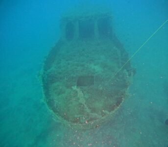 its small 20m long fishing boat at 15 m depth behind Hvar. Extra fee 50 € on a trip there.